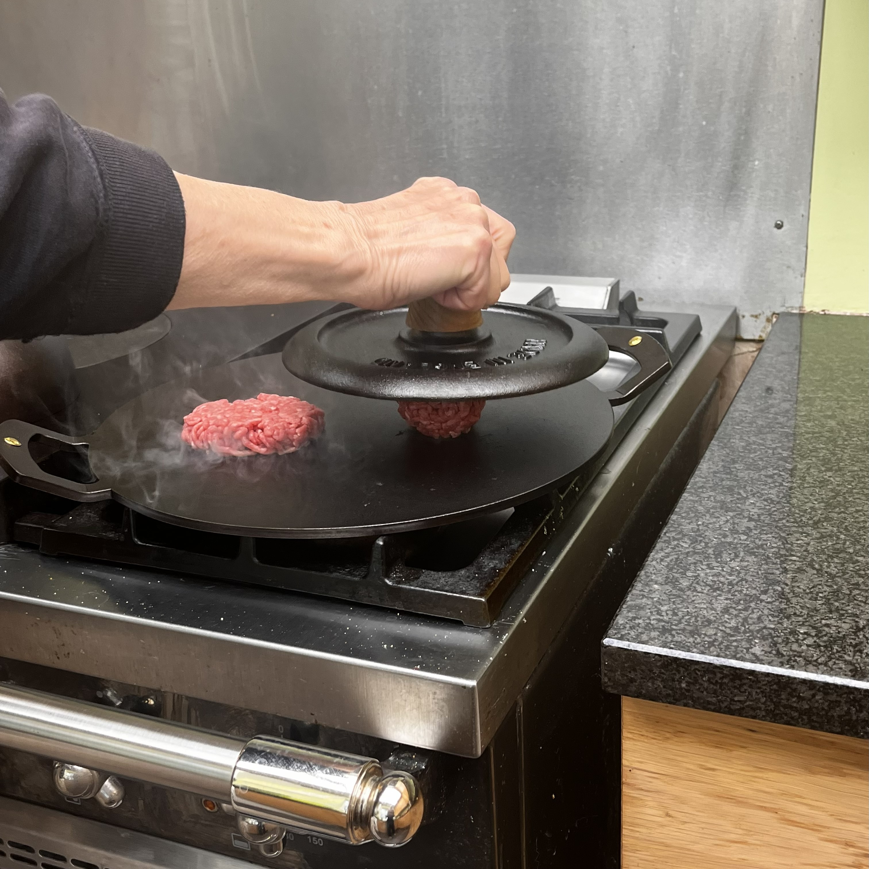 The bacon press with squish your meat to the perfect patty and then once you’ve flipped it – our iron spatula comes in handy here – drape it seductively with cheese, cover provocatively with the burger dome and wait for the magic. Our spun iron burger dome cooks burgers more evenly by trapping heat and steam, melts cheese quickly, and reduces cooking time. Your burger will emerge, the cheese melting seductively, like the silk negligée sliding off the shoulder of a 1930s Hollywood starlet. Slide it on to a toasted bun, adorn it, not with diamonds, but with relishes, ketchups, mustard and pickles and then top it off with the other half of your bun and bite! Grease, sauce or crumbs down your chin must be regarded simply as the inevitable outcome of a beautifully cooked burger.