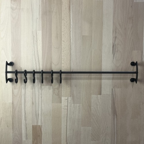 Six black iron hooks clip easily on to our utensils and pans.