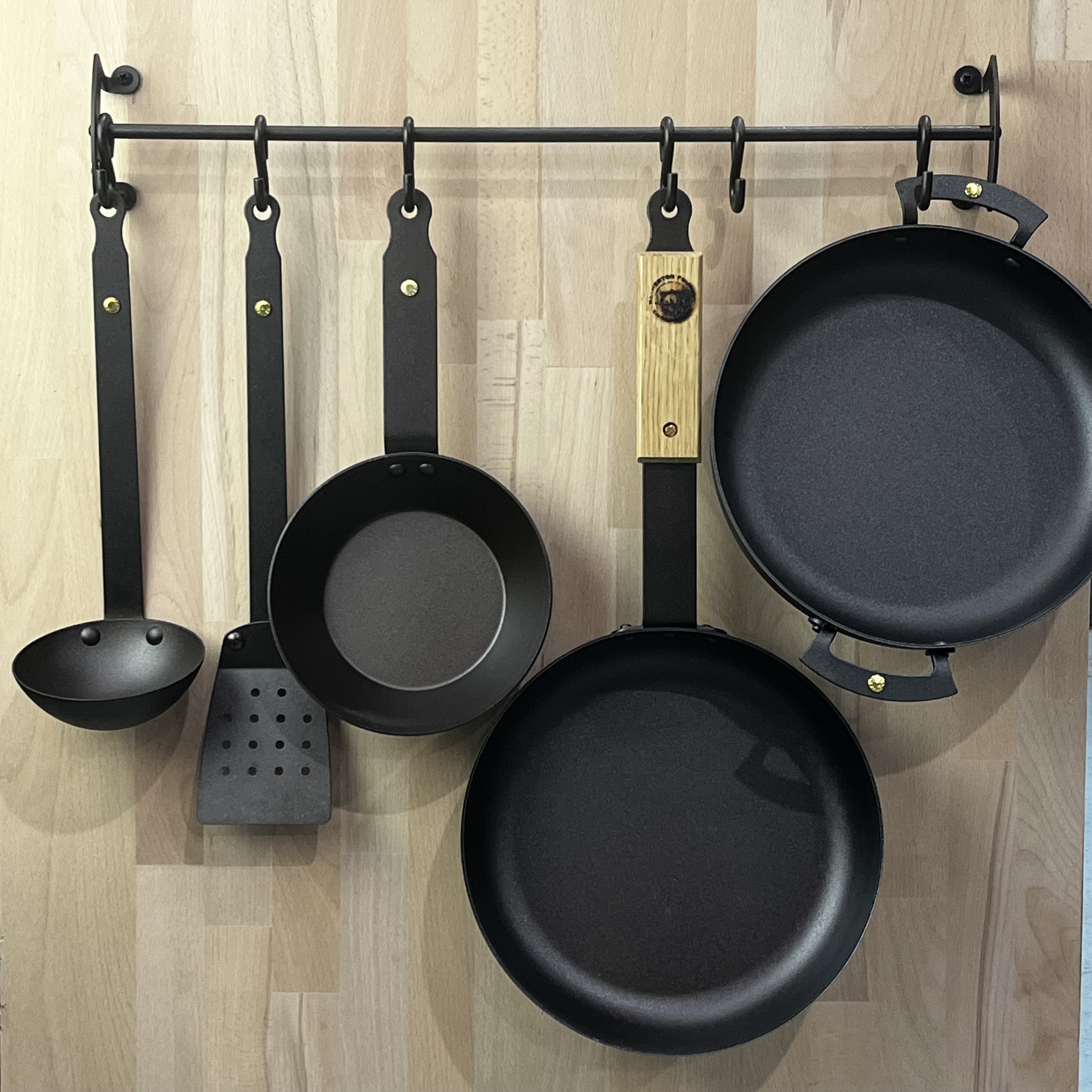 Black iron pan and utensil rail